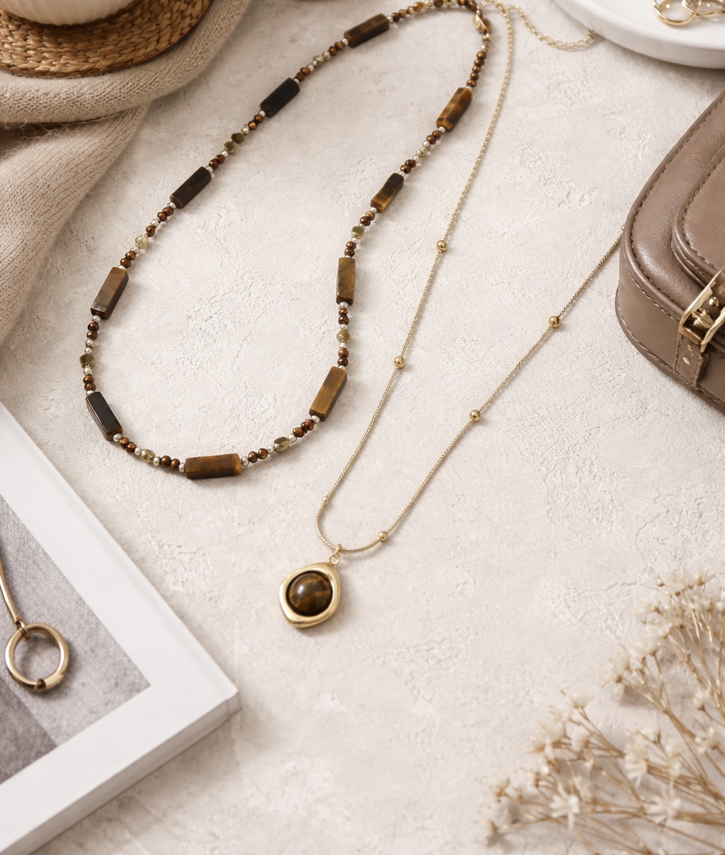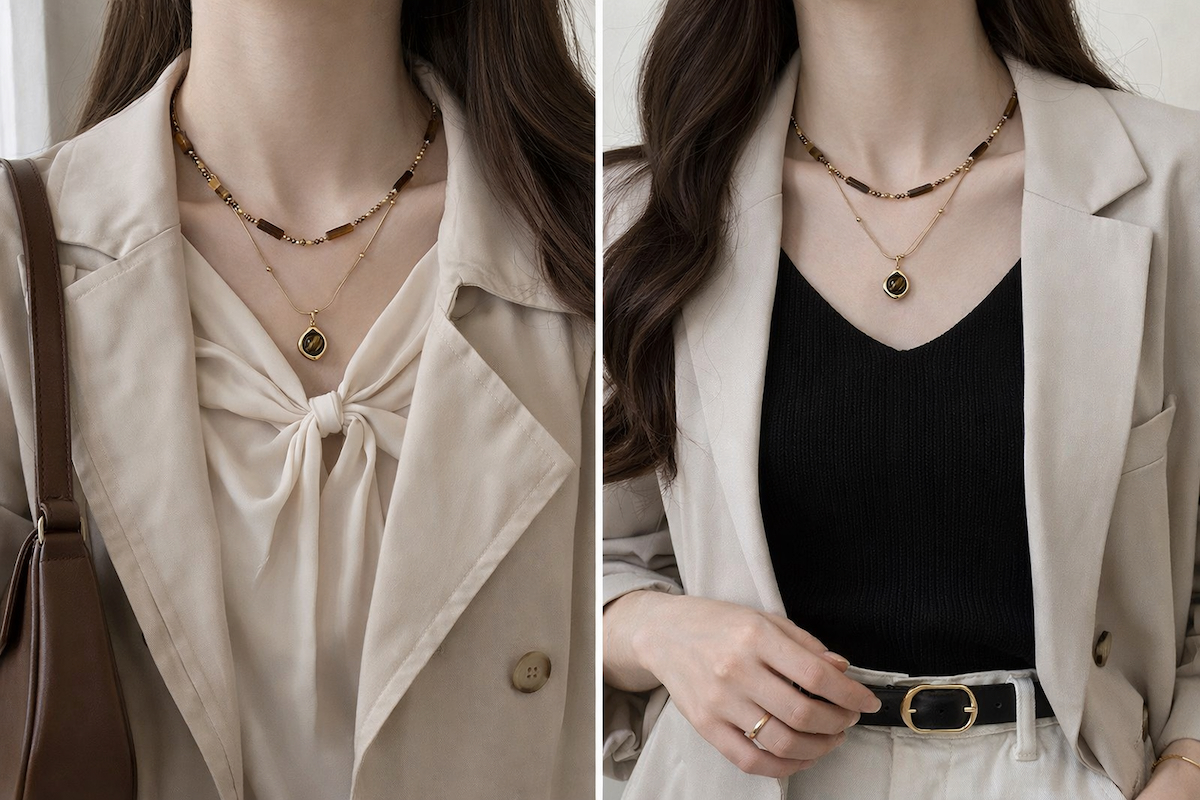 虎眼石象徵自信與守護,適合在需要穩住情緒、提升內在力量時佩戴。可單戴、可疊戴,搭配毛衣、一字領、針織或西裝外套都非常合適,不用過度打扮,就能營造鬆弛卻高級的穿搭氛圍,整個人看起來更精緻、更有氣場。