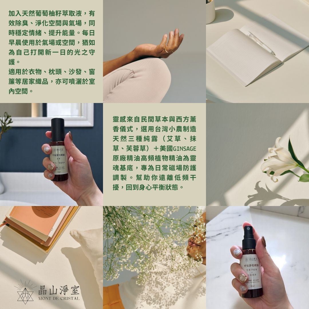 靈感來自民間草本與西方薰香儀式,選用台灣小農制造天然三種純露(艾草、抹草、芙蓉草)+美國Ginsage原廠白鼠尾草精油與廣藿香等高頻植物精油為靈魂基底,專為日常磁場防護調製。幫助你遠離低頻干擾,回到身心平衡狀態。