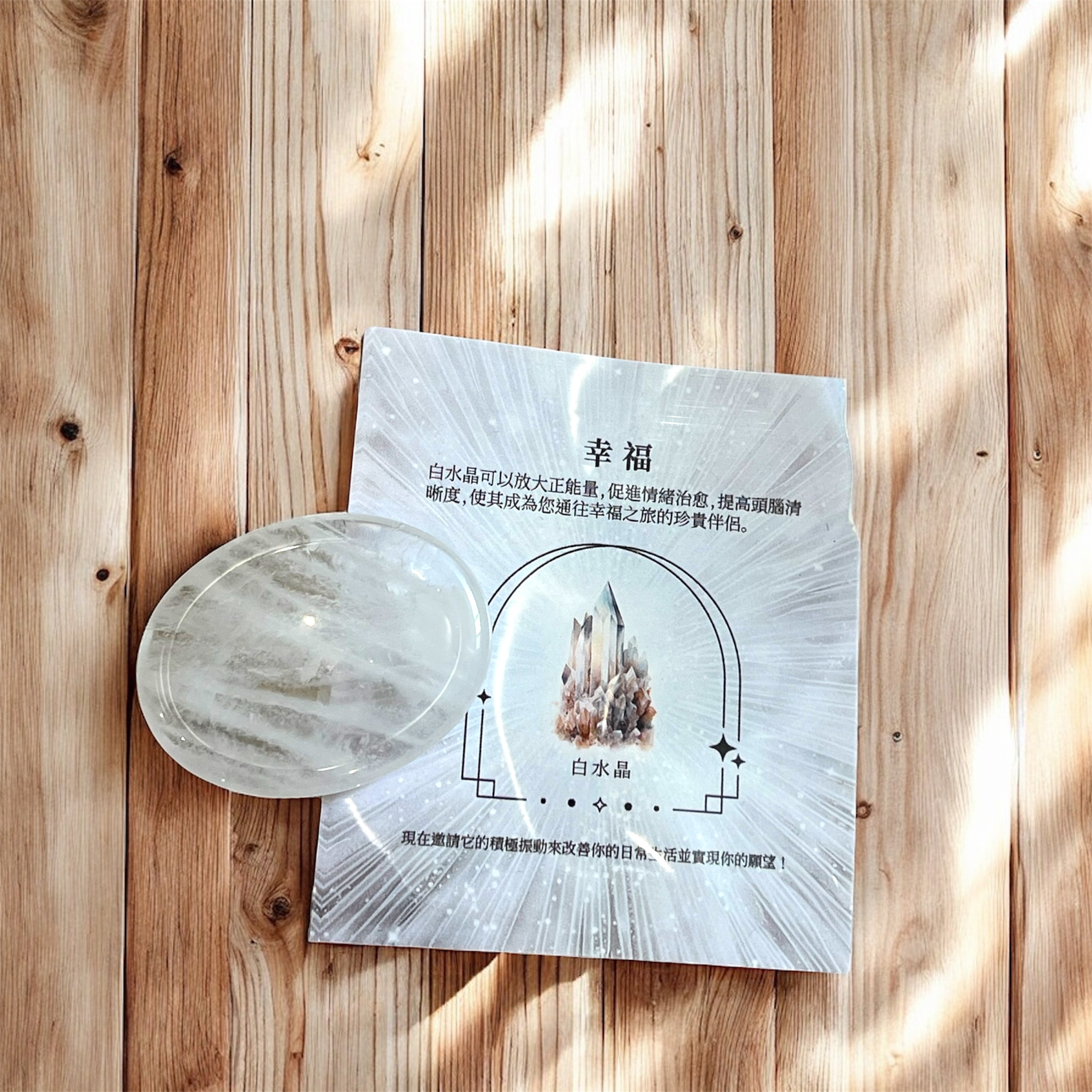 每顆水晶附有繁體中文寓意許願卡,卡片背面可寫下你的心願,讓宇宙聽見你的願望。