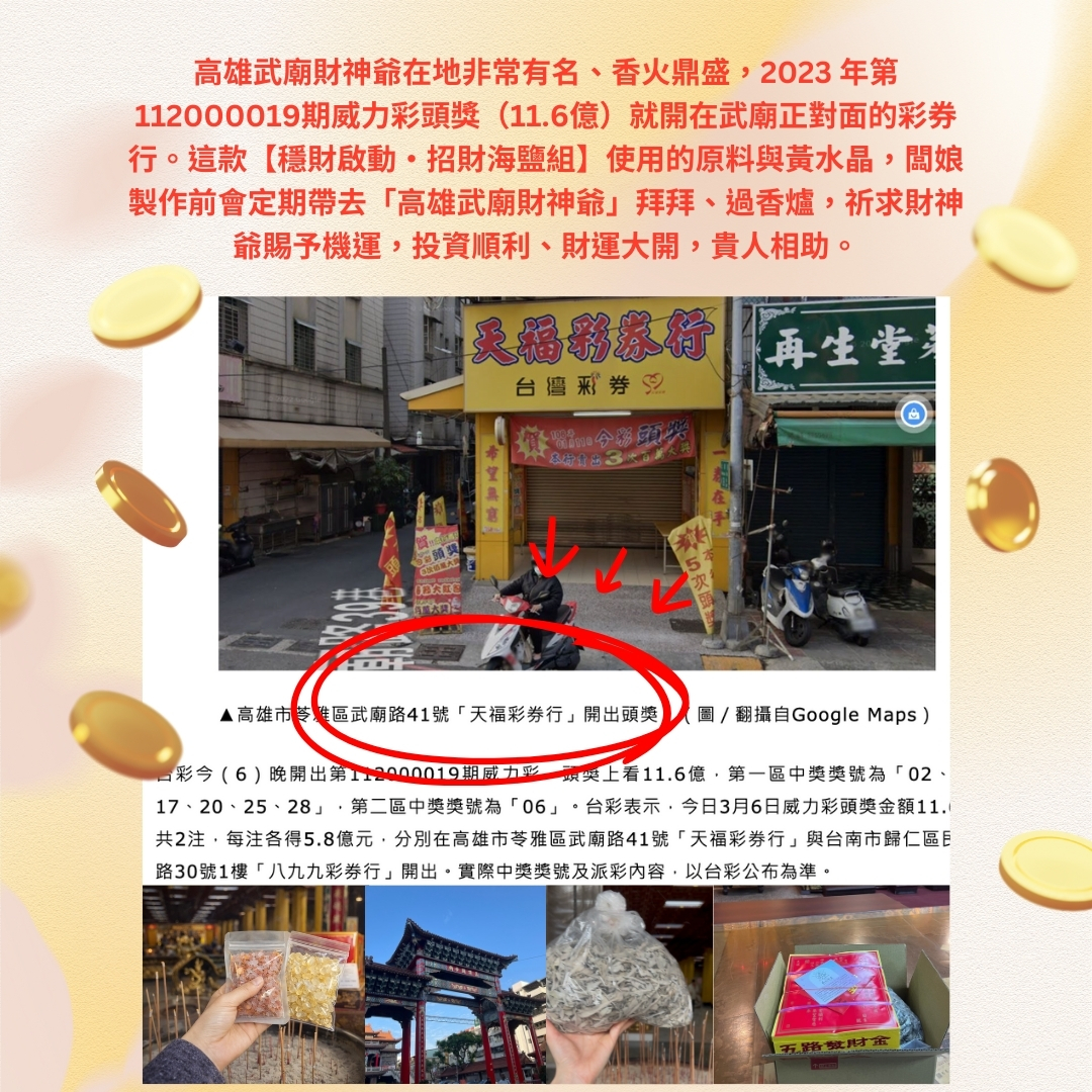 高雄武廟財神爺在地非常有名、香火鼎盛,💰2023 年第112000019期威力彩頭獎(11.6億)就開在武廟正對面的彩券行。這款【穩財啟動・招財海鹽組】使用的原料與黃水晶,老闆製作前會定期親自帶去「高雄武廟財神爺」拜拜、過香爐,祈求財神爺賜予機運,投資順利、財運大開,貴人相助。
